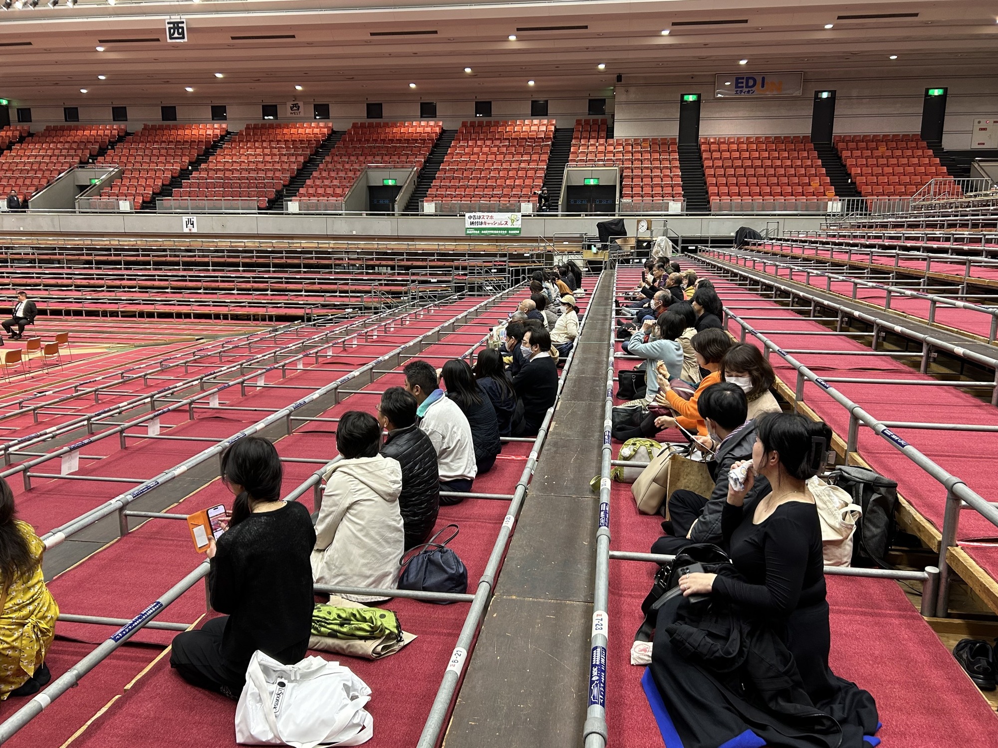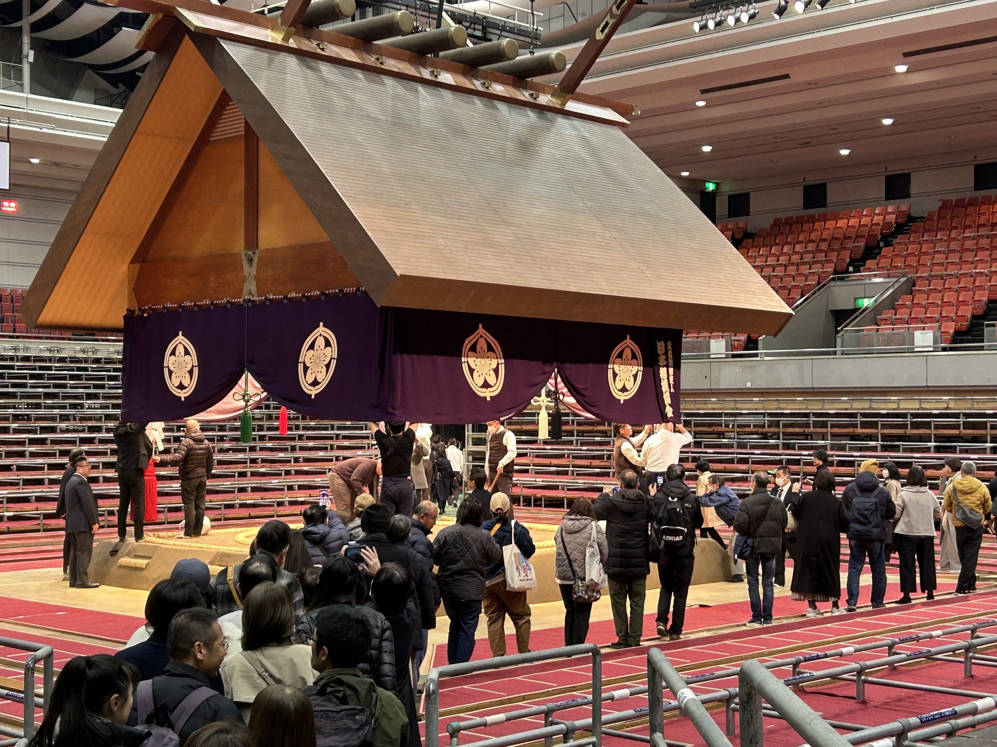 土俵祭終了後、土俵のすぐ近くで本場所準備の様子を見学しました。