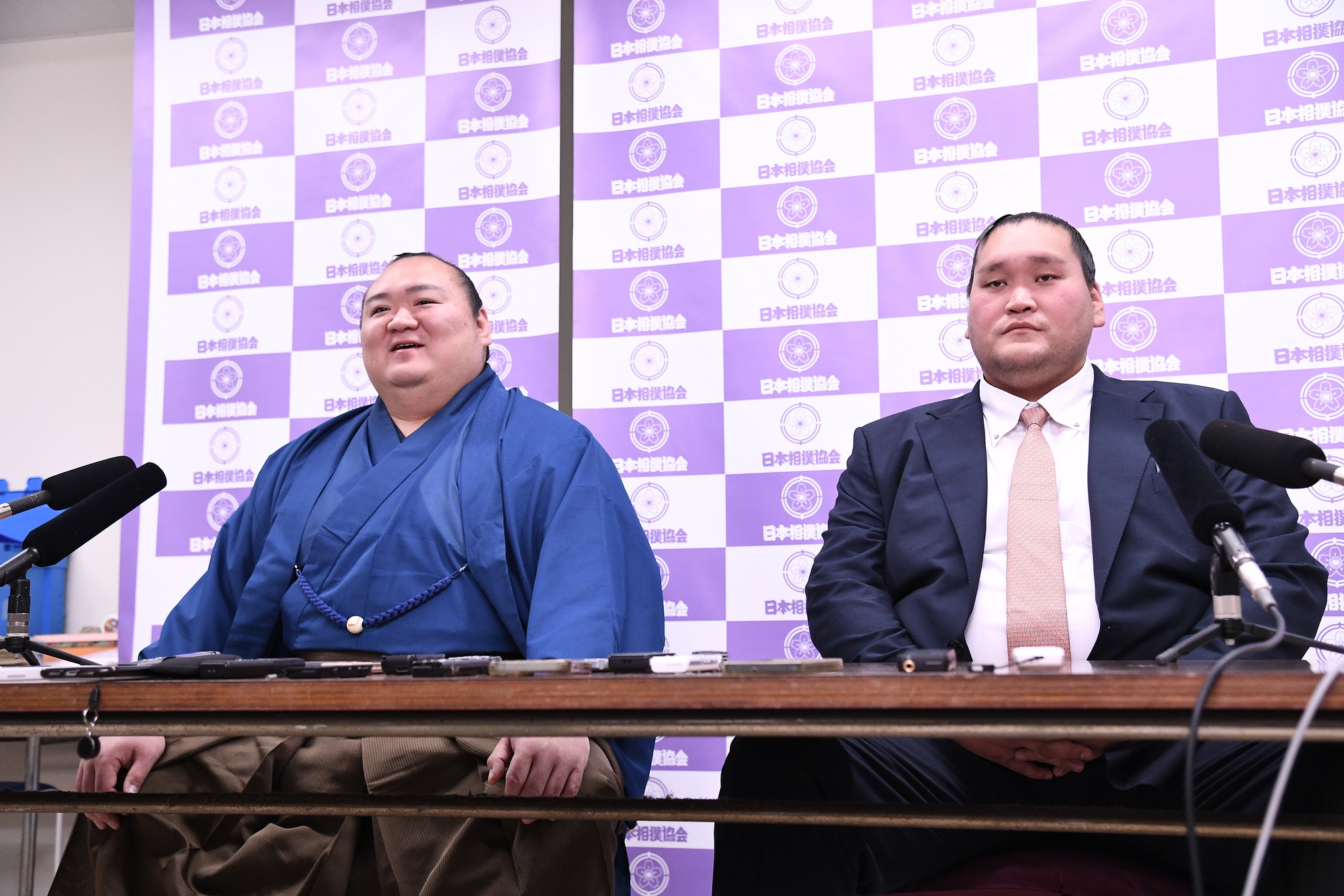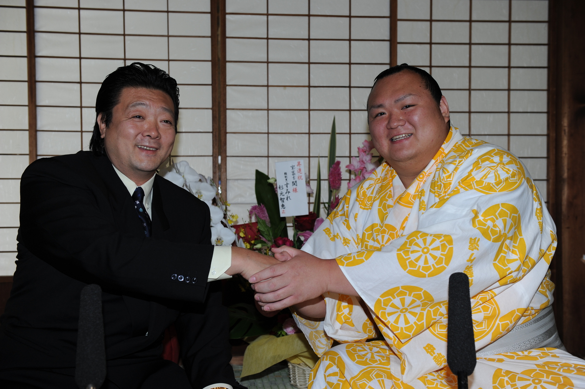 平成22年(2010年)九月場所、新十両。新十両会見には、伊勢ヶ濱親方(現 宮城野親方)も同席しました。