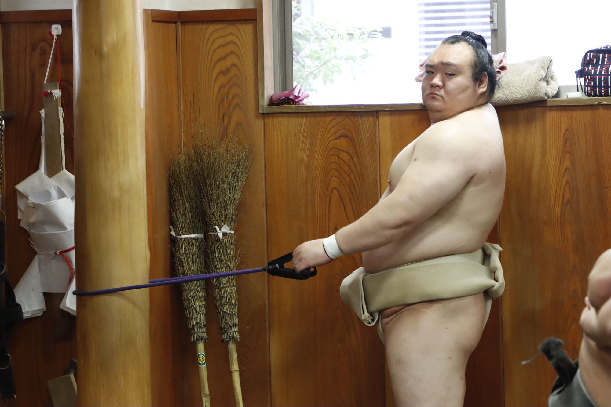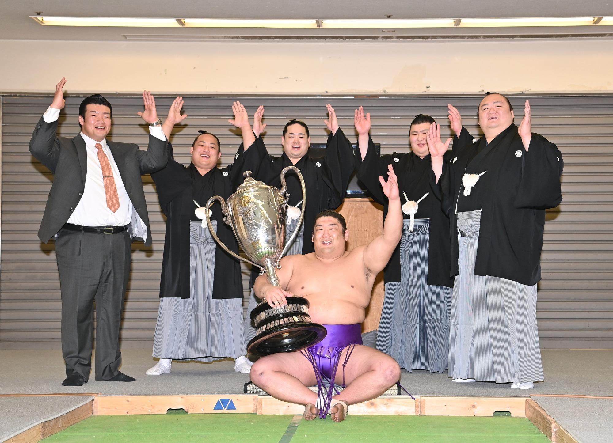 2024年(令和6年)三月場所。尊富士の幕内初優勝の際、支度部屋で万歳。