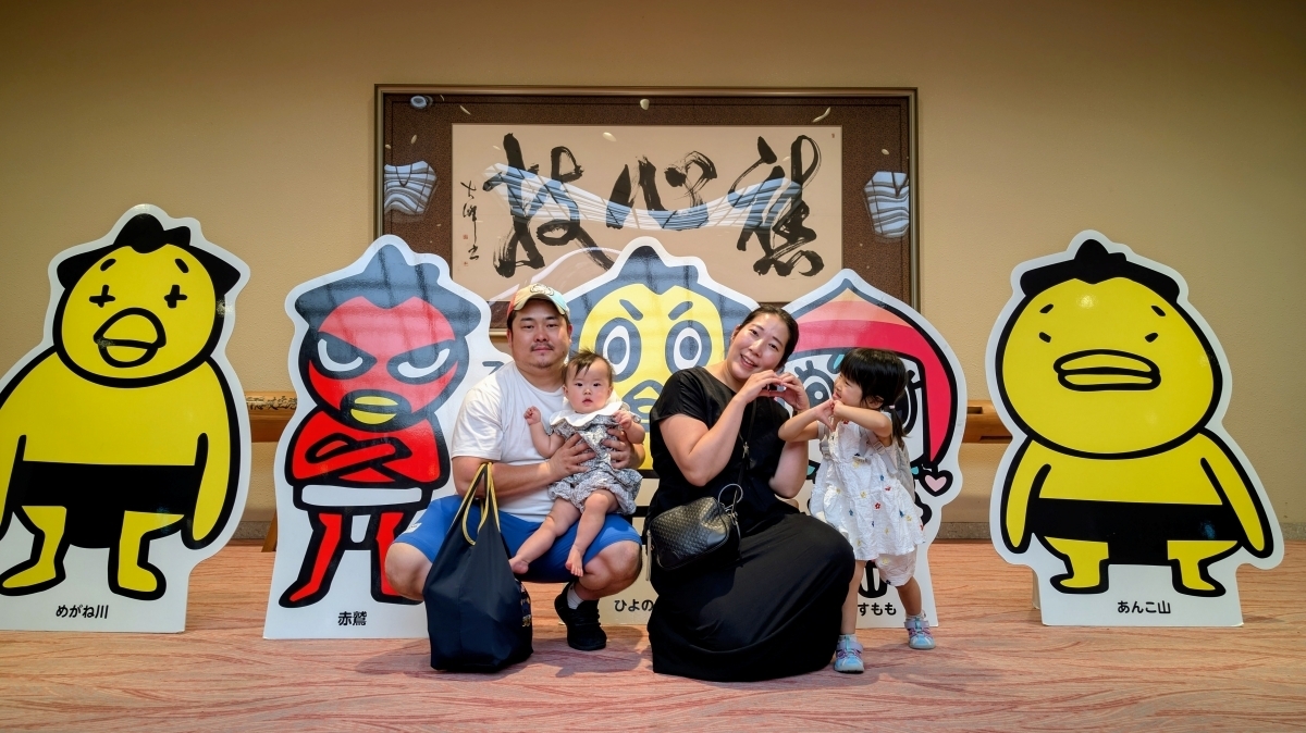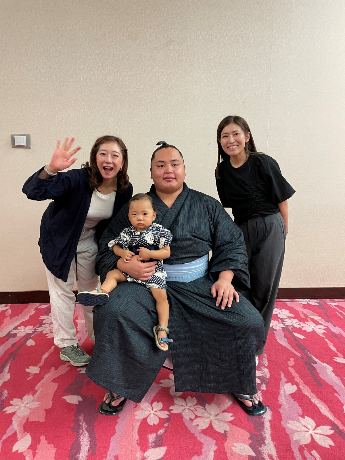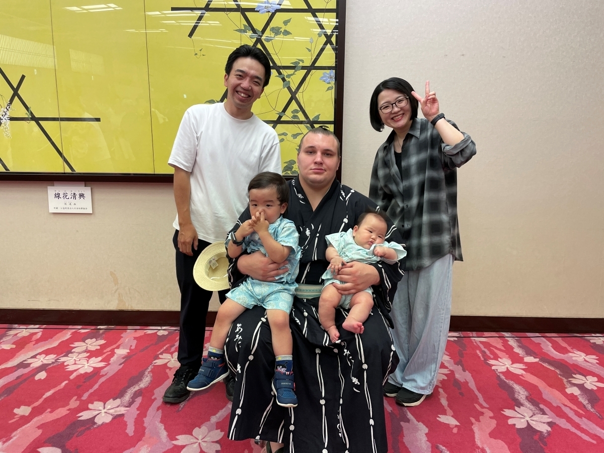 体のおおきな関取にびっくりしてしまったのか、撮影直前でお子さんが泣き出してしまうプチハプニング(?)も...
